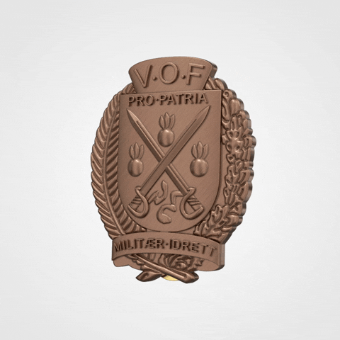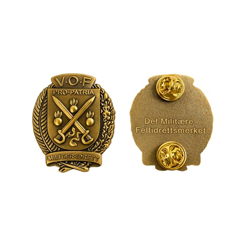 • Emblazoned with two 1888 Krag sabers and three grenades, the crest also contains two fields of text: Pro Patria (for the fatherland) and Militær feltidrett (Military Field Sports)
